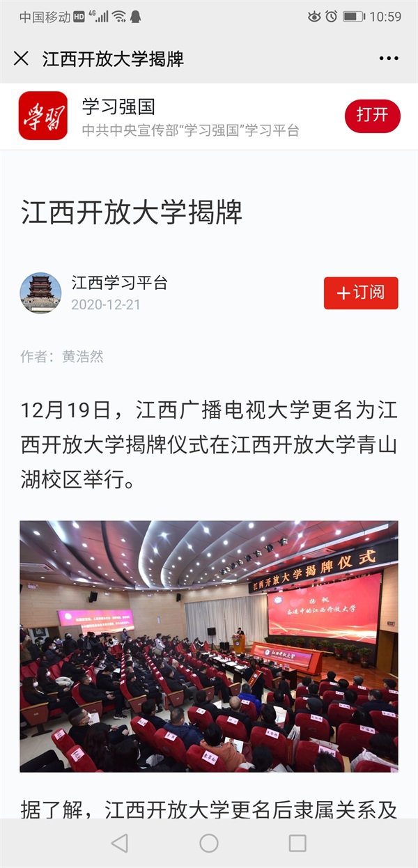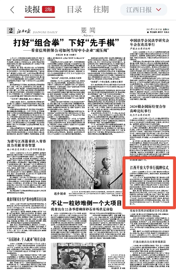 在决胜收官与谋划新局的关键之年,江西省人民政府批准江西广播电视大学更名为9999js金沙老品牌,实现了全省电大人的夙愿。1219-21日,江西日报、“学习强国”学习平台、新华社、人民网等多家主流媒体相继报道9999js金沙老品牌更名盛况。