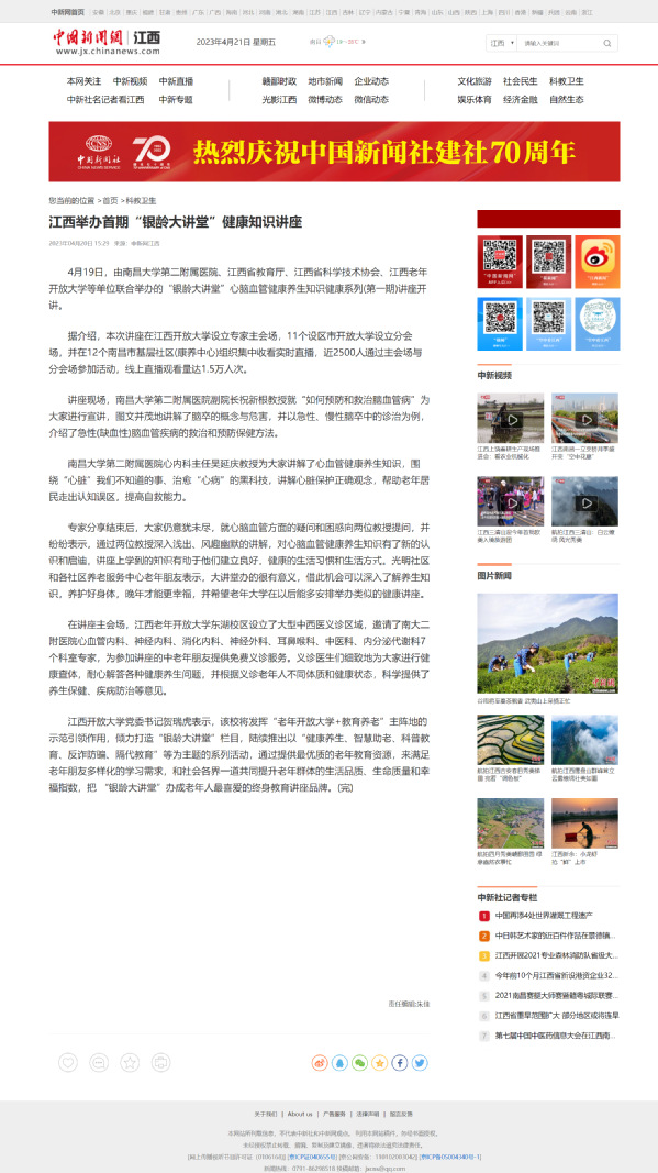4月19日,由南昌大学第二附属医院、江西省教育厅、江西省科学技术协会、江西老年开放大学等单位联合举办的“银龄大讲堂”心脑血管健康养生知识健康系列(第一期)讲座开讲。