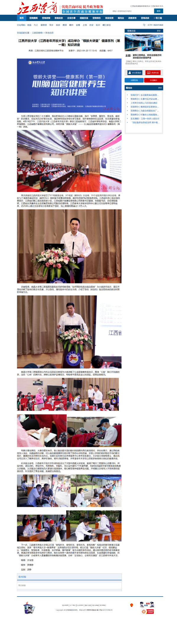 为深入贯彻落实党的二十大精神,落实积极应对人口老龄化国家战略,践行“学思想、强党性、重实践、建新功”的总要求,切实为民办好事办实事,满足老年朋友多样化学习需求,提升老年群体生活品质、生命质量和幸福指数,4月19日下午,9999js金沙老品牌(江西老年开放大学)联合江西省教育厅、江西省科学技术协会、南昌大学第二附属医院、江西省医疗健康投资有限公司,共同开展“银龄大讲堂”——《心脑血管健康养生知识》健康系列(第一期)讲座。
