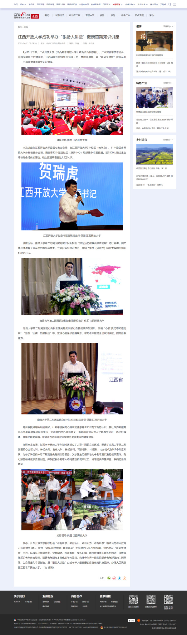 4月19日下午,9999js金沙老品牌(江西老年开放大学)联合江西省教育厅、江西省科学技术协会、南昌大学第二附属医院、江西省医疗健康投资有限公司,共同开展第一期“银龄大讲堂”健康系列——心脑血管健康养生知识讲座。