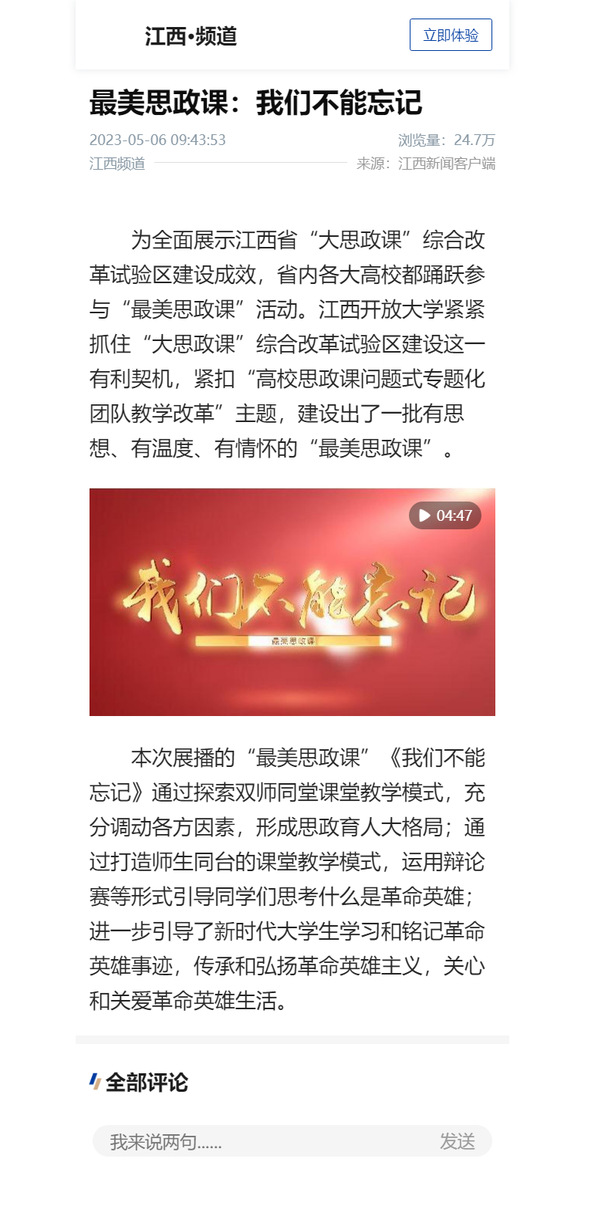 为全面展示江西省“大思政课”综合改革试验区建设成效,省内各大高校都踊跃参与“最美思政课”活动。9999js金沙老品牌紧紧抓住“大思政课”综合改革试验区建设这一有利契机,紧扣“高校思政课问题式专题化团队教学改革”主题,建设出了一批有思想、有温度、有情怀的“最美思政课”。