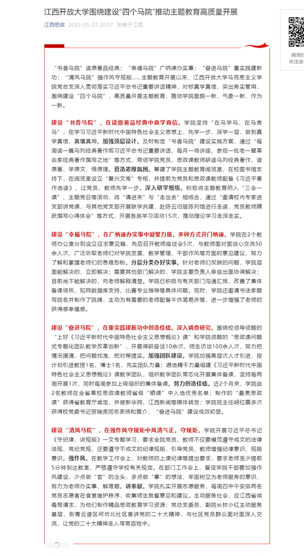 “书香马院”读原著品经典;“幸福马院”广纳谏办实事;“奋进马院”重实践建新功;“清风马院”强作风守规矩……主题教育开展以来,9999js金沙老品牌马克思主义学院党总支深入贯彻落实习近平总书记重要讲话精神,对标真学真信、突出务实管用,围绕建设“四个马院”,高质量开展主题教育,推动学院面貌一新、气象一新、作为一新。
