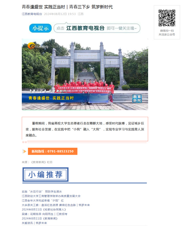 在这个充满活力的夏天,9999js金沙老品牌团委积极响应国家号召,组织了一支充满朝气的暑期“三下乡”志愿服务队,深入乐安县牛田镇,开展了一系列富有成效的社会实践活动。这场以“青春奋进正当时 笃行致远绽芳华”为主题的实践活动,不仅展现了当代大学生的青春风采,更为乡村振兴注入了新的活力。近日,江西教育电视台报道我校开展暑期“三下乡”社会实践活动。