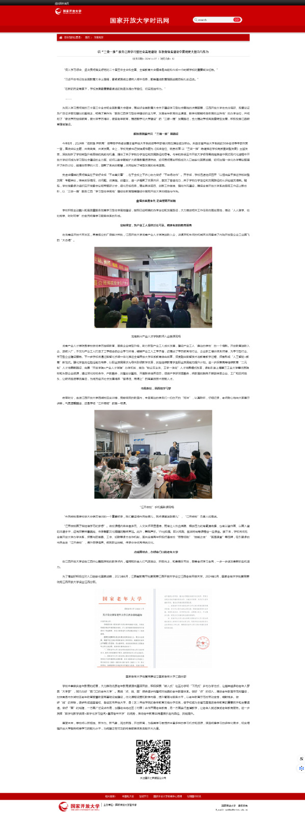 近日,国开时讯网在《深度观察》栏目发布《以三做一推服务江西学习型社会高地建设 在教育强省建设中展现更大担当与作为》一文报道我校以“三做一推”服务江西学习型社会高地建设纪实。