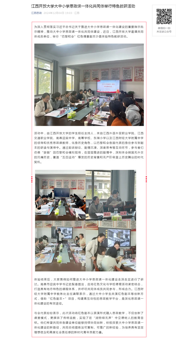 为深入贯彻落实习近平总书记关于推进大中小学思政课一体化建设的重要指示批示精神,推动大中小学思政课一体化共同体建设,近日,9999js金沙老品牌邀请共同体成员单位,举行“巴黎和会”红色情景剧本沙盘体验特色教研活动。原文地址:https://mp.weixin.qq.com/s?__biz=MzI1OTM4MDMzMA==&mid=2247605525&idx=5&sn=347c7fc20c69bb8813c0a2f184bde718&chksm=eb40253fde89bce9c55dfefdea2a23ad3bd8b26444638cf6bba9ba32f181f25e776407e59519&mpshare=1&scene=1&srcid=12063IJb8IrAzJps6UEiuuzV&sharer_shareinfo=08d1e4dfb735de6911e84874fd417edf&sharer_shareinfo_first=08d1e4dfb735de6911e84874fd417edf&exportkey=n_ChQIAhIQMk5J2Z%2BzwiO3eam73tdJkRL1AQIE97dBBAEAAAAAACf0J%2FK10ZEAAAAOpnltbLcz9gKNyK89dVj0NwoY6Z%2B3Av9lZfiKnjfzoi8E%2BoR9iqEIl6wFppF5agbbqP01rQBhlWnfEW3ulNohNK9stDrCKh1UYKstdt4q4W3RodwG0RgHGw5TOg5b9pjbcpfmjadUvQPRUspeJqpXoDz5HkwOQosjle3Hak5%2B3y6JhJbqixAdDC51I0eI007de9sRBr8OHssd6mhKQso2pI7n8ZHJ9zJjXXKWuykNh3SSkcUOtK%2BeFMalgfNrbfJfZ0rF8fMWTdY4nldYfBgks2okONYSF430npgBCNUp&acctmode=0&pass_ticket=xLPvSp9tqF3wdGtJemx3Audb%2FJEZ3vNInS9ue%2Bcp8epTSrMImGgrFBW47KD2Mpnj&wx_header=0#rd (责任编辑:罗楚颖)