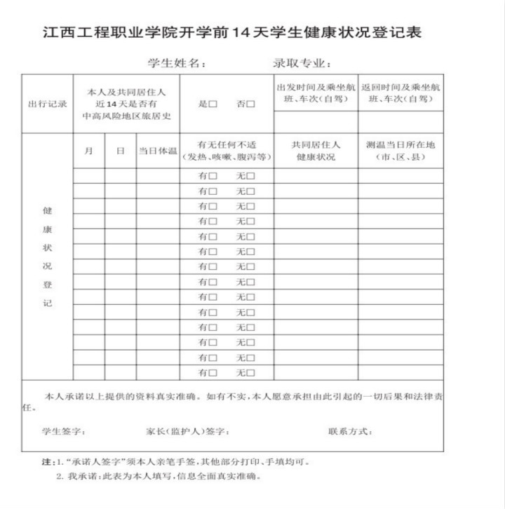 “一表”指《2021年江西工程职业学院开学前14天健康状况登记表》(自行下载),学生本人和家长应按表式要求如实填报,开学当天交辅导员。
