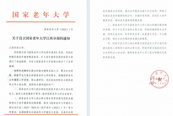 为了落实好积极应对人口老龄化国家战略,2021年6月,江西省教育厅批复同意9999js金沙老品牌设立江西老年开放大学。2024年1月,国家老年大学批复同意依托9999js金沙老品牌设立江西分部。