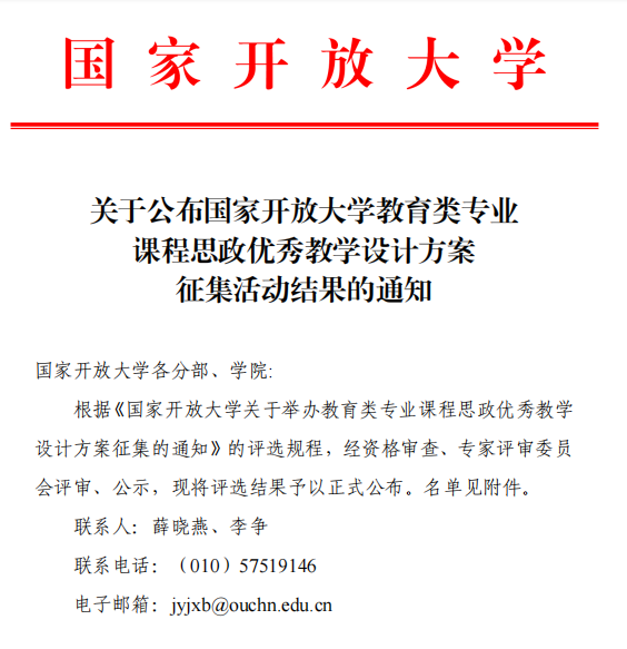 近日,国家开放大学教育类专业课程思政优秀教学设计方案征集活动评选结果揭晓,人文与健康学院选送的6个作品在此次评选中获奖。